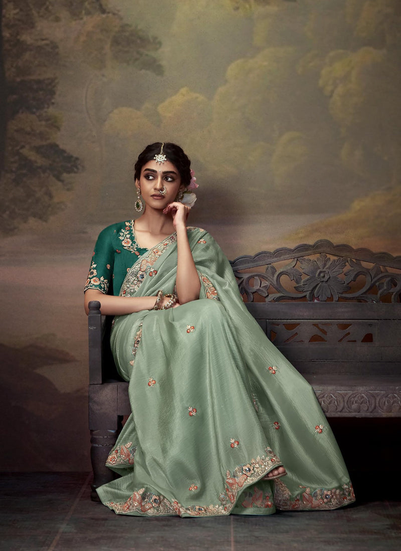 Pista Tissue Organza With Heavy Sequence, Zari & Thread Work Border With Heavy Designer Blouse Saree