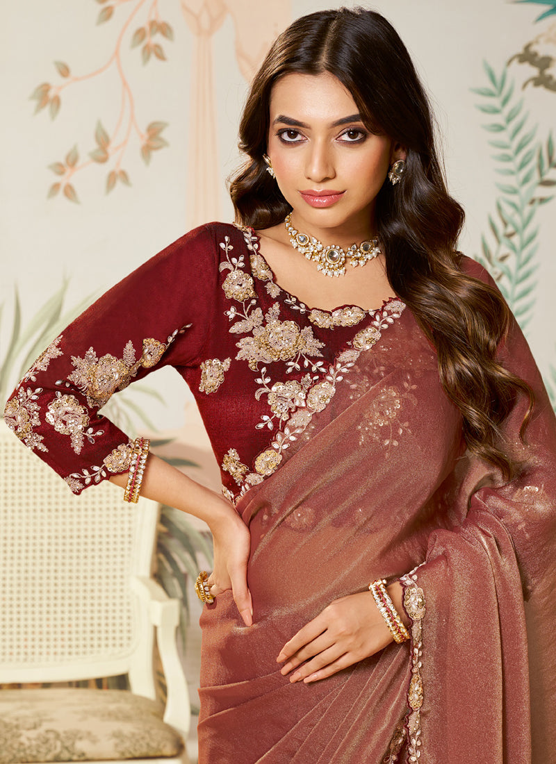 Light Maroon Satin Silk Organza Sequence With Hand Work Designer Contrast Blouse Party Wear Saree