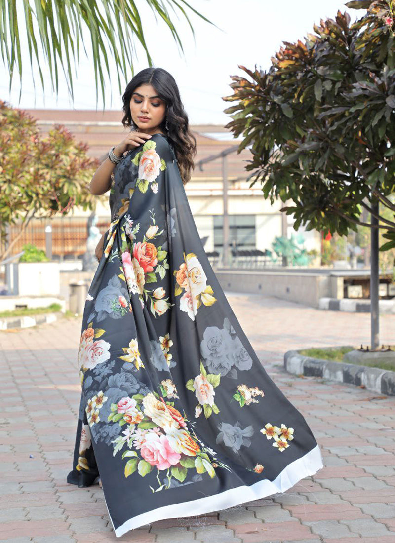 The saree in the image is described as a luxurious Original Japan Satin (Devsena Satin) saree with ensuring comfort and a graceful drape.Black digital print. It measures 6.30 meters in length and includes a 0.80-meter Banglory satin blouse piece. This type of saree is considered elegant and suitable for festive occasions, weddings, parties, and sophisticated casual wear. The fabric is known for being ultra-soft, lightweight, and glossy,
