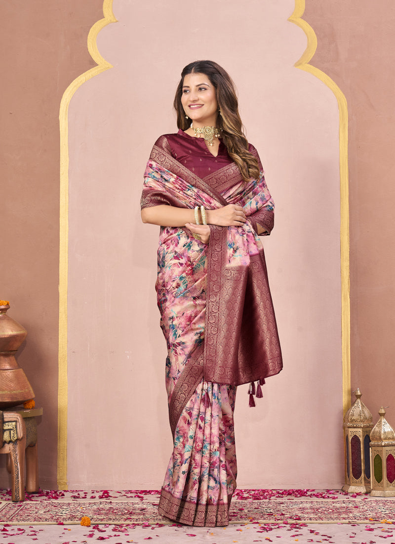 Maroon Tussar Silk Jacquard Abstract Digital Print Saree with Unstitched Blouse