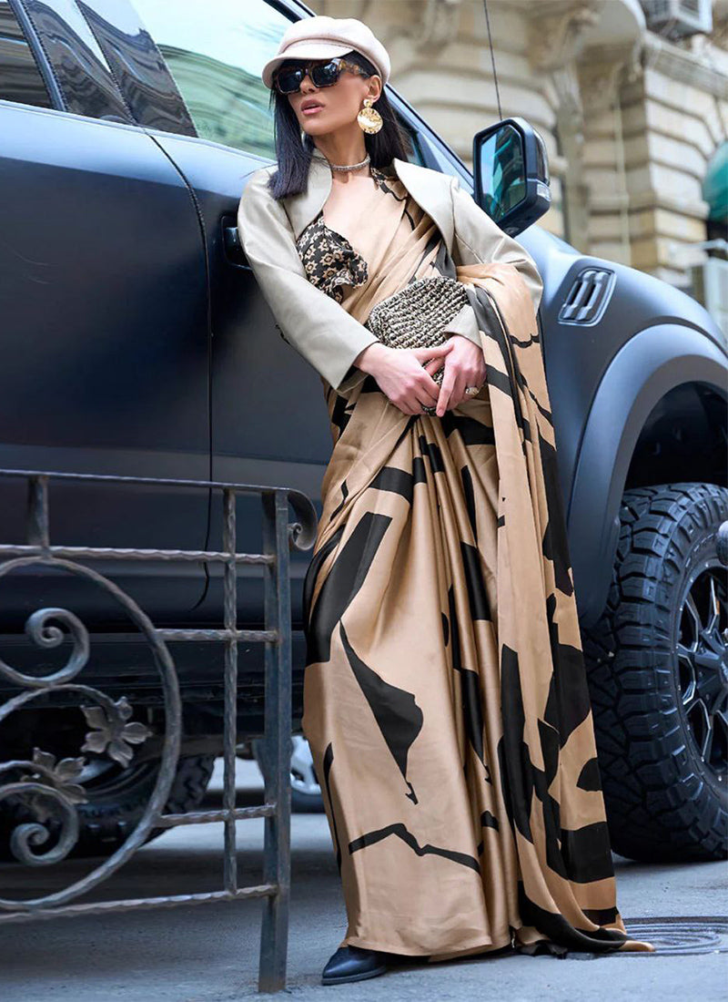 The saree in the image is described as a luxurious Original Japan Satin (Devsena Satin) saree with ensuring comfort and a graceful drape.Brown digital print. It measures 6.30 meters in length and includes a 0.80-meter Banglory satin blouse piece. This type of saree is considered elegant and suitable for festive occasions, weddings, parties, and sophisticated casual wear. The fabric is known for being ultra-soft, lightweight, and glossy,