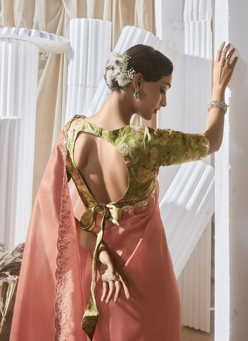 Salmon Tissue Silk Sequence Work Digital Printed Blouse Party Wear Saree