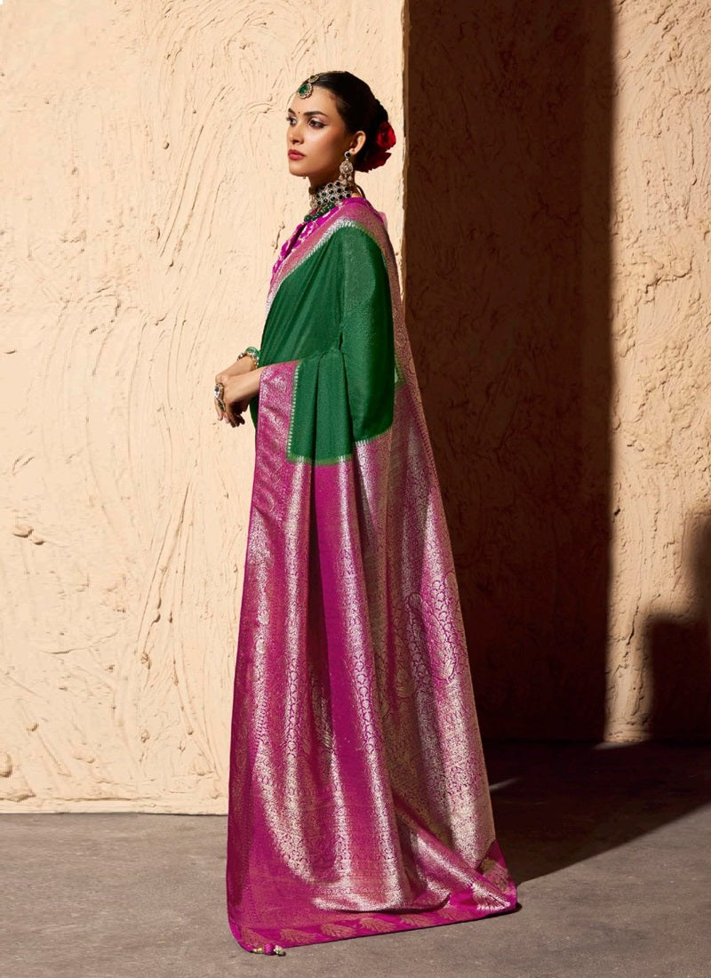 Make a bold and elegant statement with our Green Pure Viscose Silk Saree, crafted to perfection for festive and special occasions. The luxurious viscose silk fabric drapes beautifully, while intricate zari weaving adds a rich, shimmering detail that enhances its regal appeal. Delicate tassel accents on the pallu add a touch of sophistication, and the coordinating brocade blouse completes the ensemble. Ideal for weddings, parties, and grand celebrations, this saree embodies timeless beauty and classic charm.