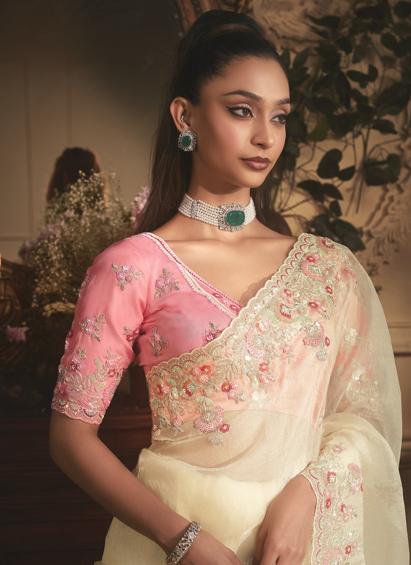 Off-White Tissue Organza With Heavy Embroidery Sequence Cut Work Border And Designer Butta Work All Over Saree