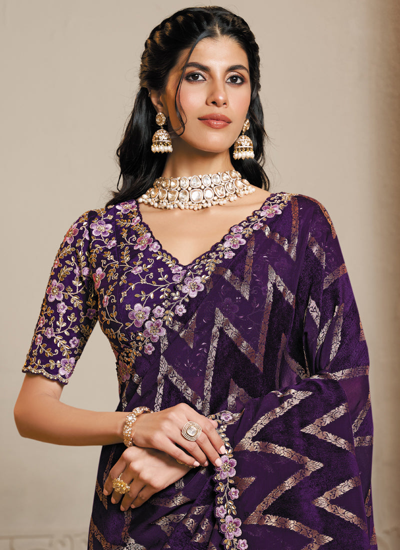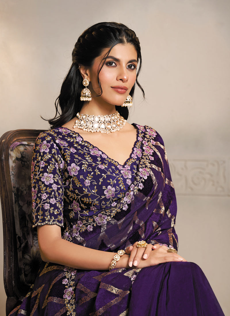 Dark Purple Jacquard Velvet Silk Multi Threads Embroidery & Handwork Heavy Designer Saree