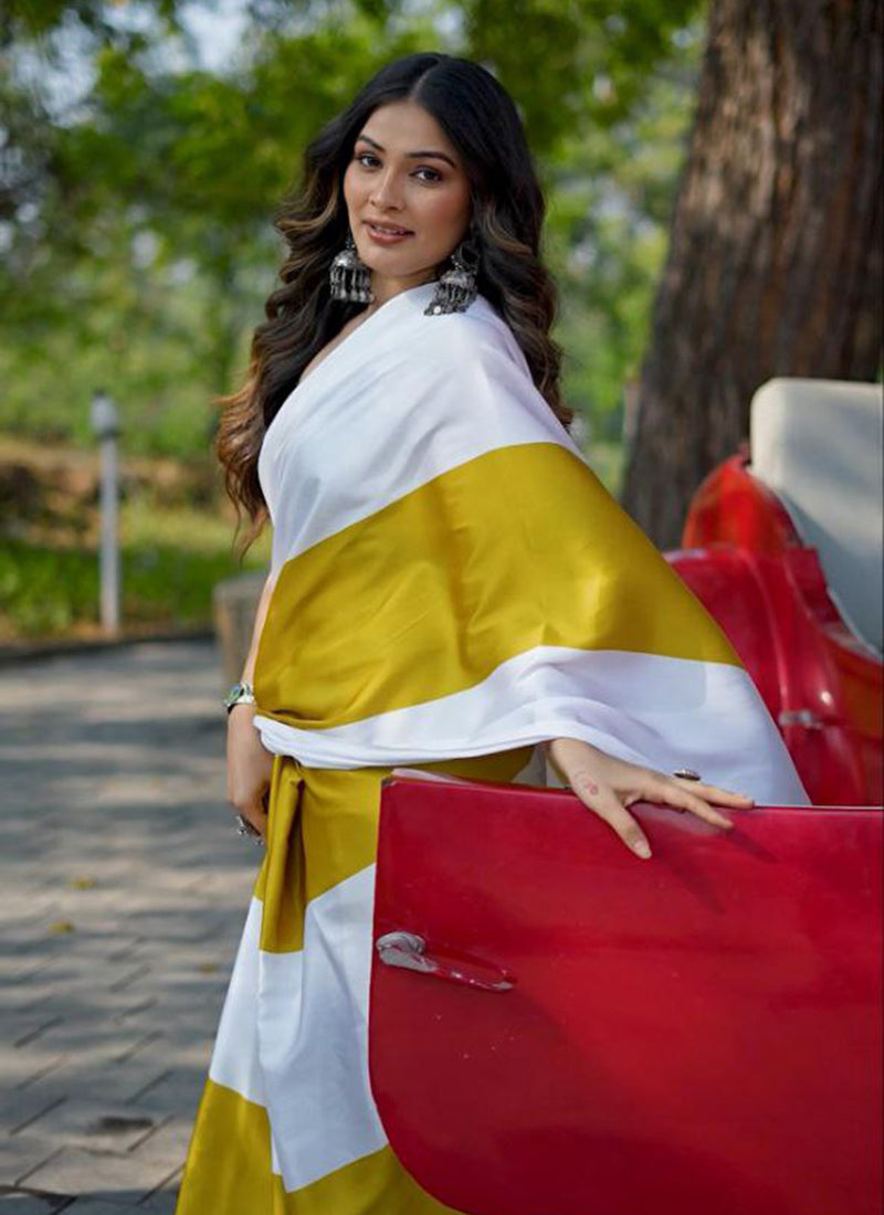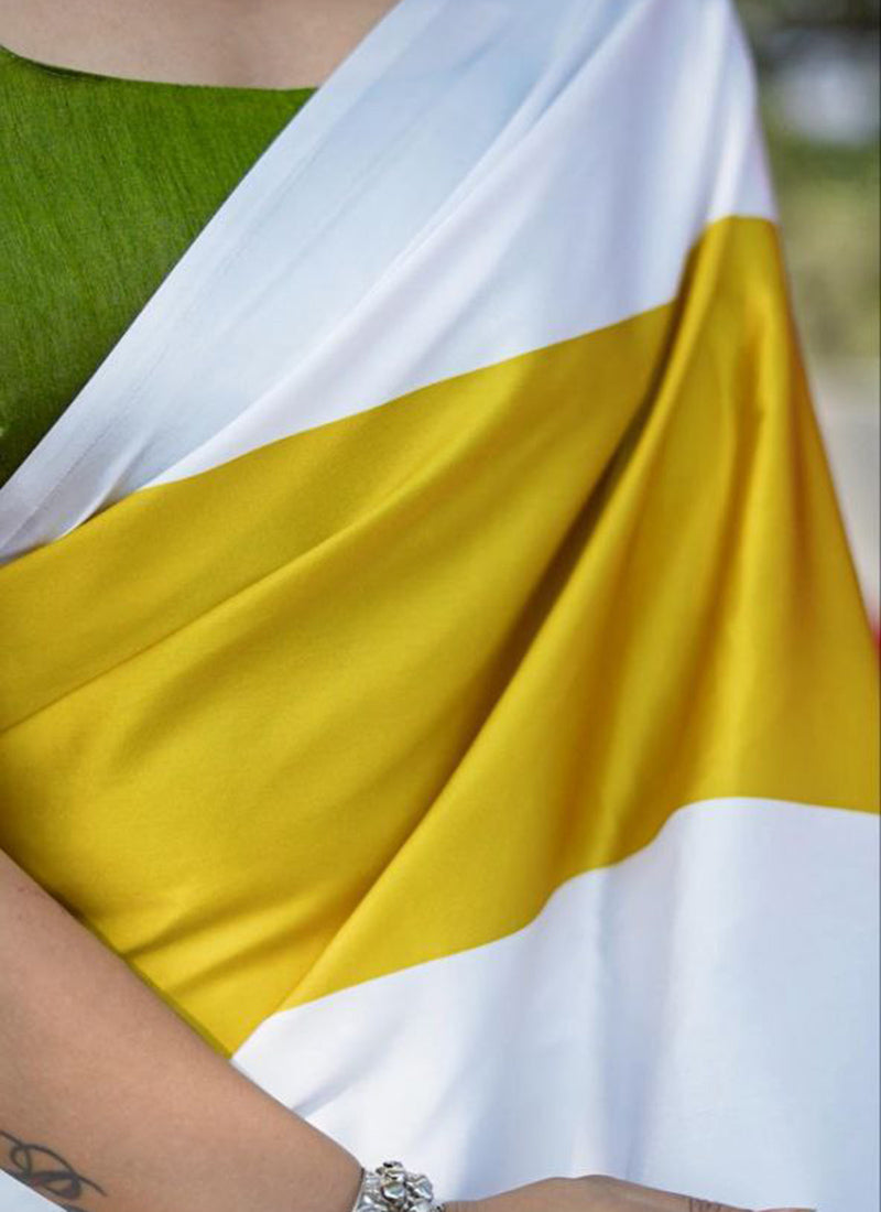 The saree in the image is described as a luxurious Original Japan Satin (Devsena Satin) saree with ensuring comfort and a graceful drape.Multicolor digital print. It measures 6.30 meters in length and includes a 0.80-meter Banglory satin blouse piece. This type of saree is considered elegant and suitable for festive occasions, weddings, parties, and sophisticated casual wear. The fabric is known for being ultra-soft, lightweight, and glossy,