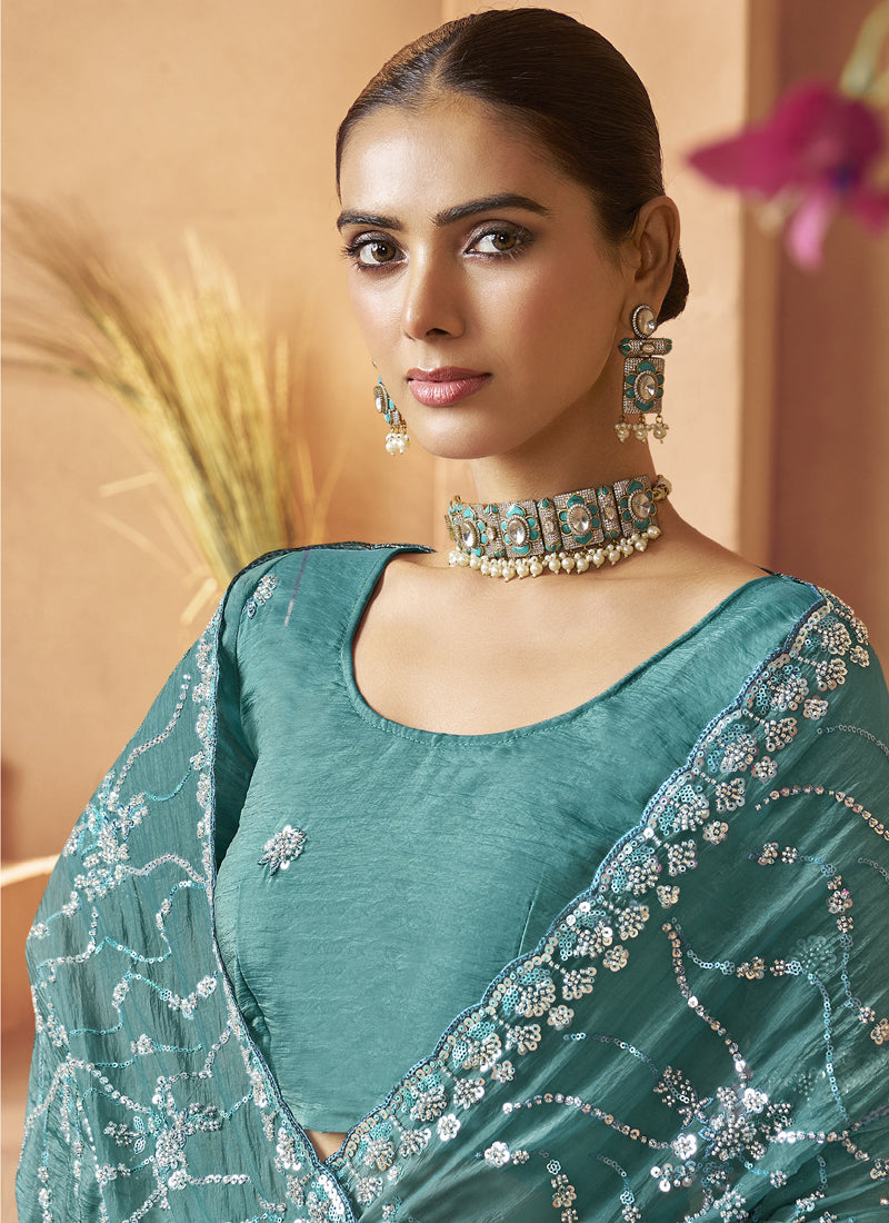 Turquoise Tissue Silk Heavy Sequence, Beads With Designer Blouse Party Wear Saree