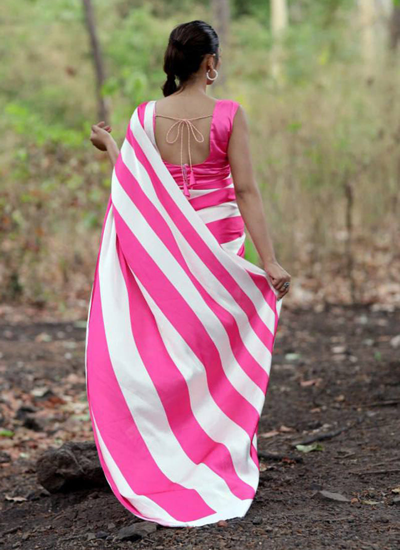 The saree in the image is described as a luxurious Original Japan Satin (Devsena Satin) saree with ensuring comfort and a graceful drape.Pink digital print. It measures 6.30 meters in length and includes a 0.80-meter Banglory satin blouse piece. This type of saree is considered elegant and suitable for festive occasions, weddings, parties, and sophisticated casual wear. The fabric is known for being ultra-soft, lightweight, and glossy,