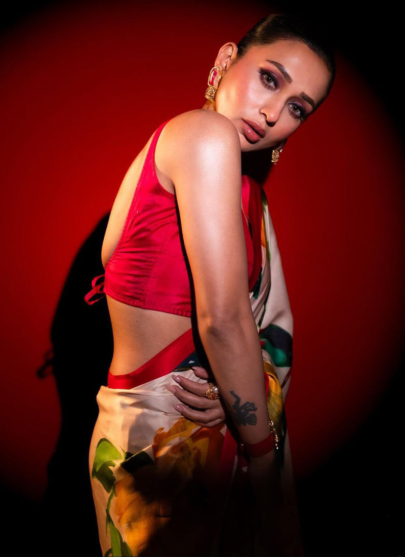 The saree in the image is described as a luxurious Original Japan Satin (Devsena Satin) saree with ensuring comfort and a graceful drape.Off White digital print. It measures 6.30 meters in length and includes a 0.80-meter Banglory satin blouse piece. This type of saree is considered elegant and suitable for festive occasions, weddings, parties, and sophisticated casual wear. The fabric is known for being ultra-soft, lightweight, and glossy,