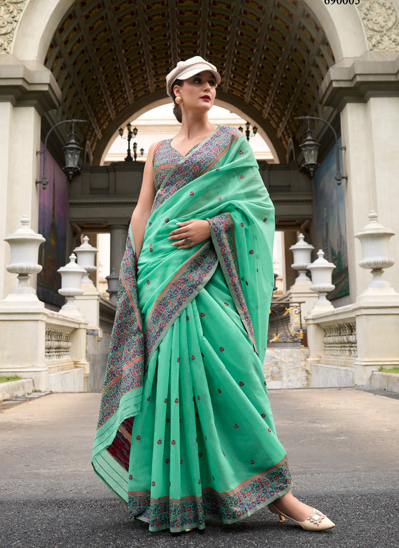 Turquoise Soft Linen Cotton With Minakari Pallu & Blouse Casual Wear Saree