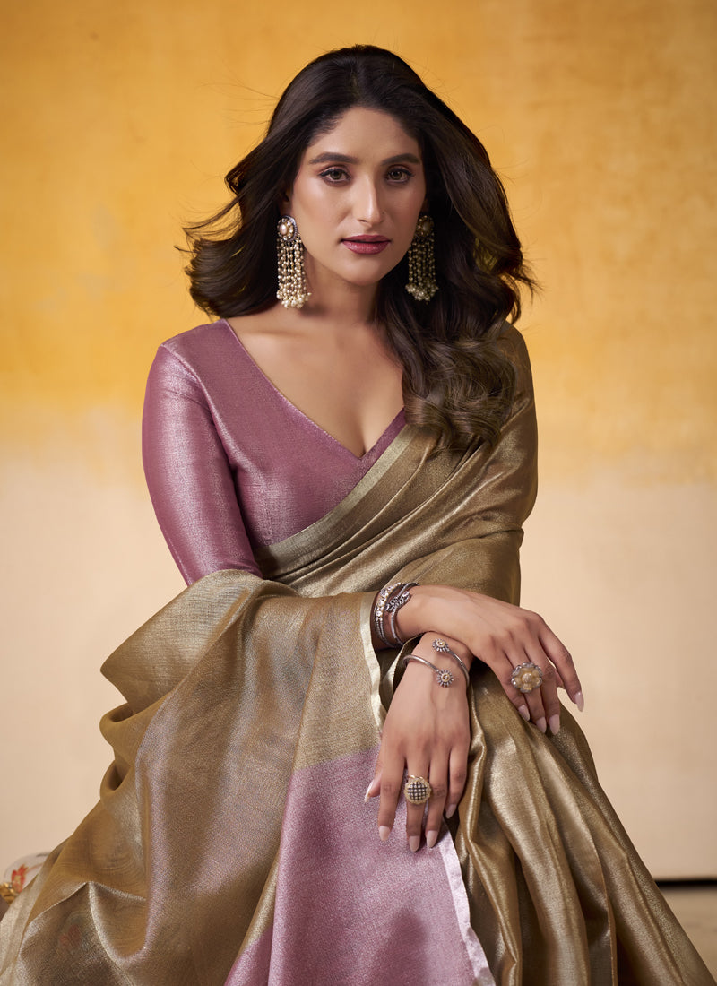Chiku Tissue Silk With Beautiful Tussle On Pallu Casual & Office Wear Saree
