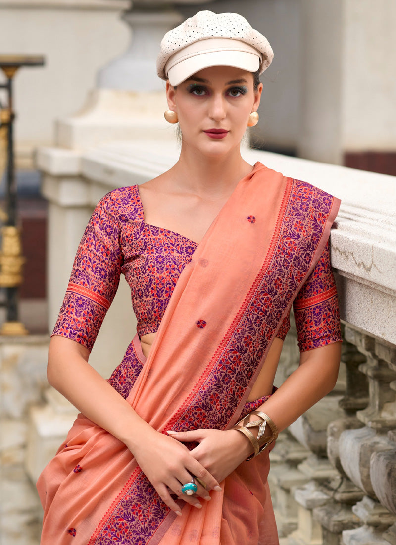 Light Peach Soft Linen Cotton With Weaved Pallu & Blouse Casual Wear Saree