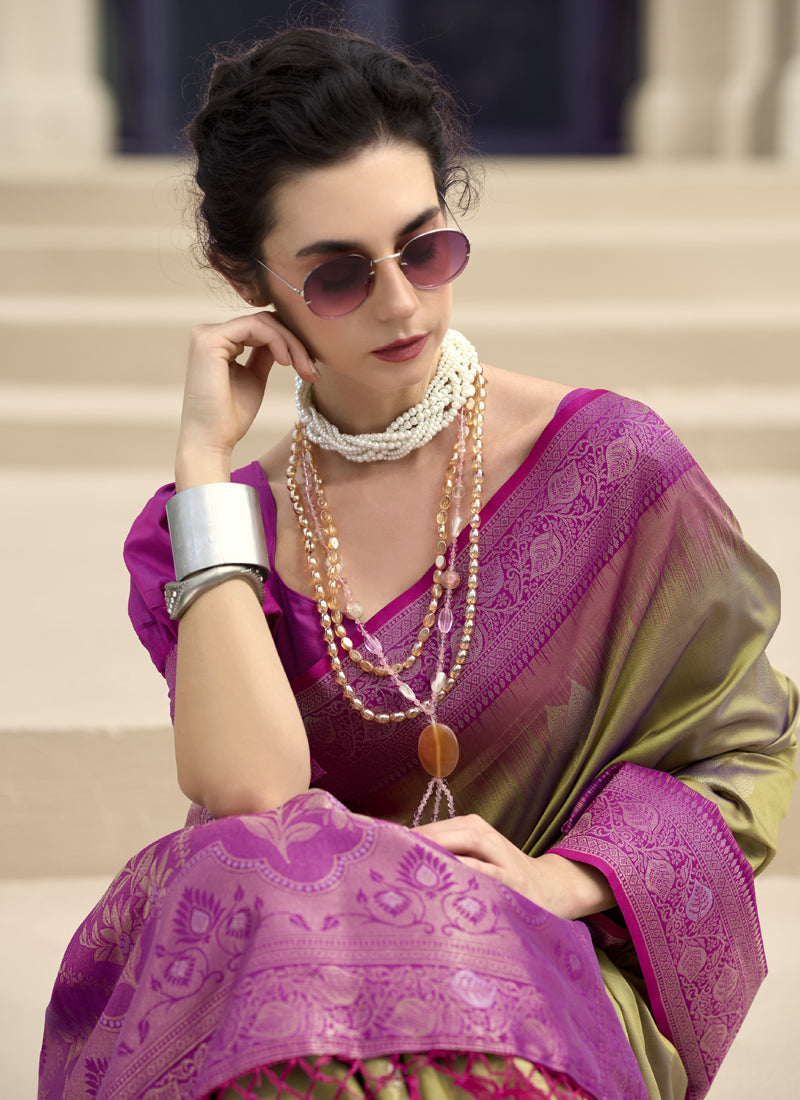 Mehndi & Pink Soft Silk Zari Weaving With Tussle On Pallu Tradtional Wear Saree