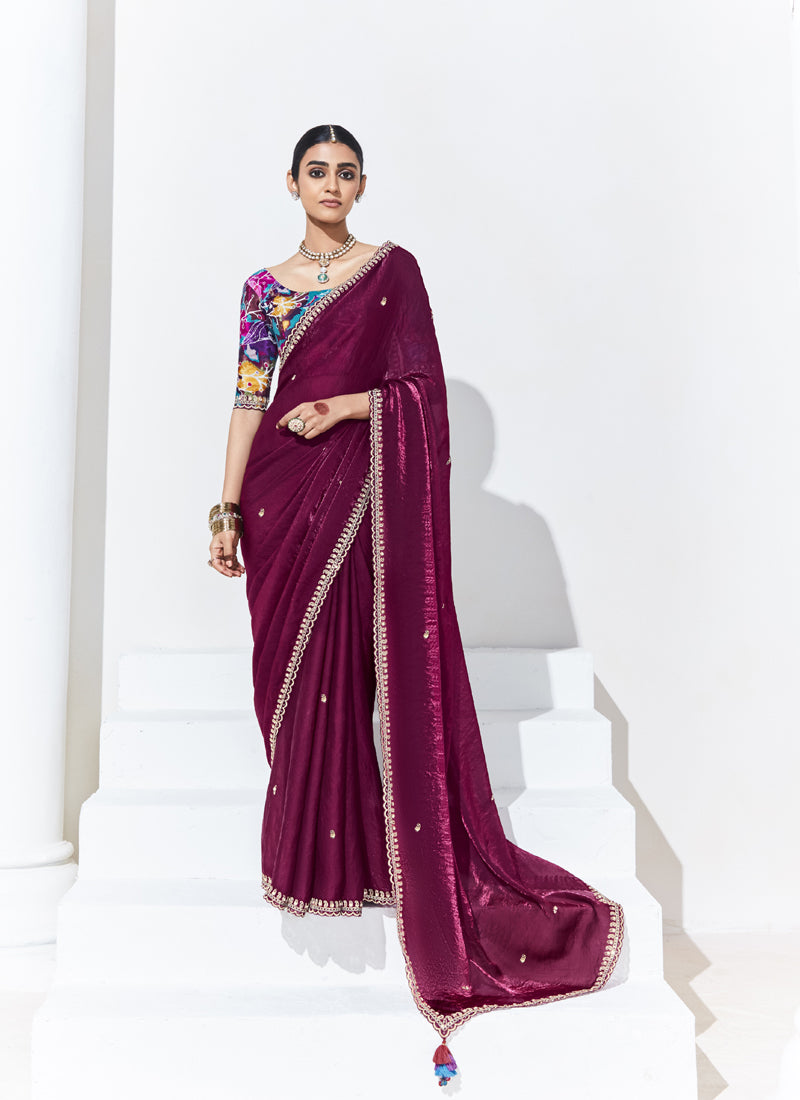 Maroon Glass Tissue Sequence & Thread Embroidered Butti Work Satin Silk Digital Printed Party Wear Saree