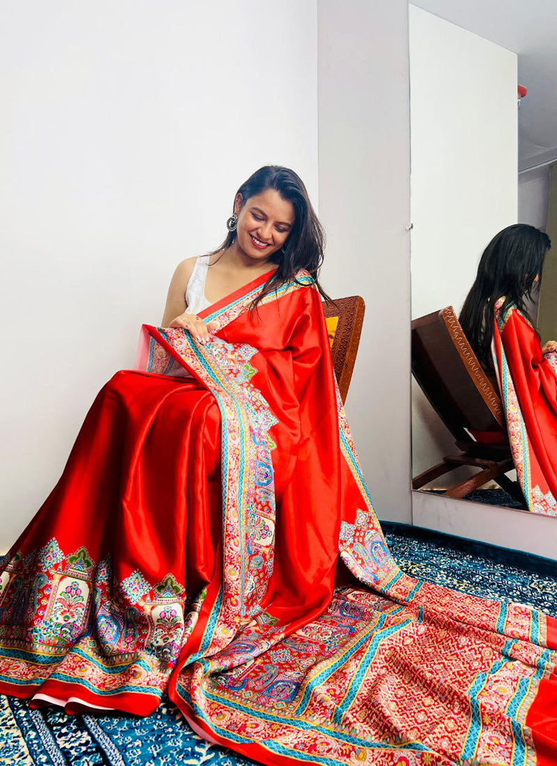 The saree in the image is described as a luxurious Original Japan Satin (Devsena Satin) saree with ensuring comfort and a graceful drape.Red digital print. It measures 6.30 meters in length and includes a 0.80-meter Banglory satin blouse piece. This type of saree is considered elegant and suitable for festive occasions, weddings, parties, and sophisticated casual wear. The fabric is known for being ultra-soft, lightweight, and glossy,