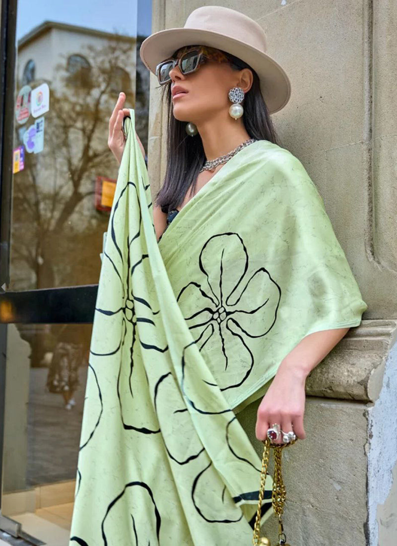 The saree in the image is described as a luxurious Original Japan Satin (Devsena Satin) saree with ensuring comfort and a graceful drape.Sea Green digital print. It measures 6.30 meters in length and includes a 0.80-meter Banglory satin blouse piece. This type of saree is considered elegant and suitable for festive occasions, weddings, parties, and sophisticated casual wear. The fabric is known for being ultra-soft, lightweight, and glossy,