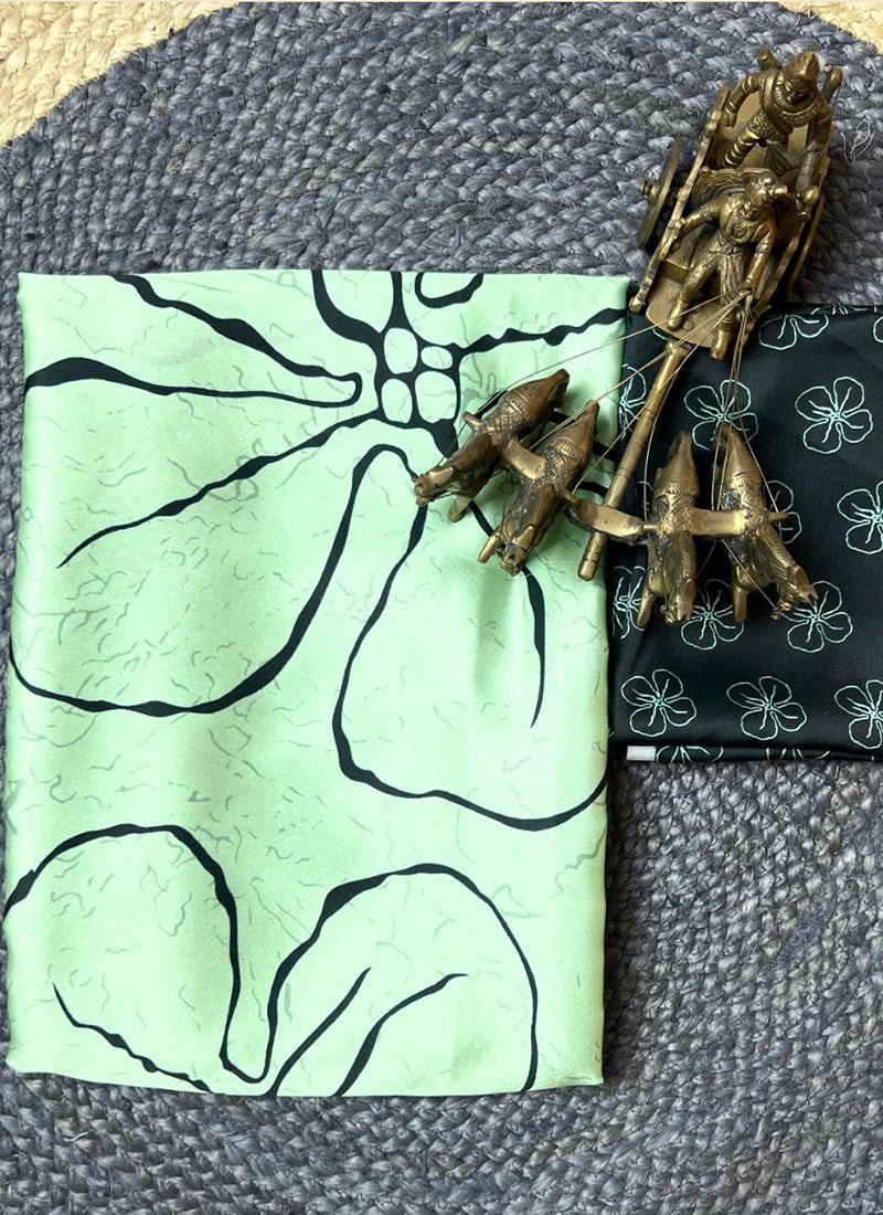 Sea Green Original Japan Devsena satin Saree Japan Satin Digital Print Blouse