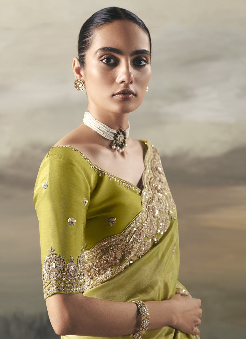 Step into refreshing elegance with this captivating Light Pear Saree. The soft, delicate pear green hue offers a unique and modern alternative to traditional colors, while the heavy designer border adds a touch of opulent grandeur. This ensemble is perfect for weddings, formal receptions, and upscale festive events, complete with a designer blouse piece for a perfectly curated look.