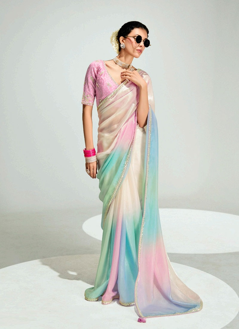 Shaded Off White & Multi Color Organza Tissue With Heavy Sequence & Thread Work Border Designer Saree