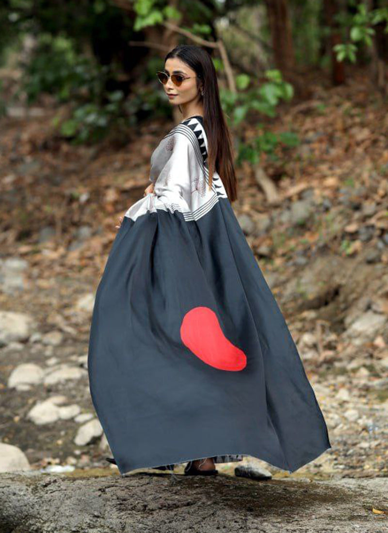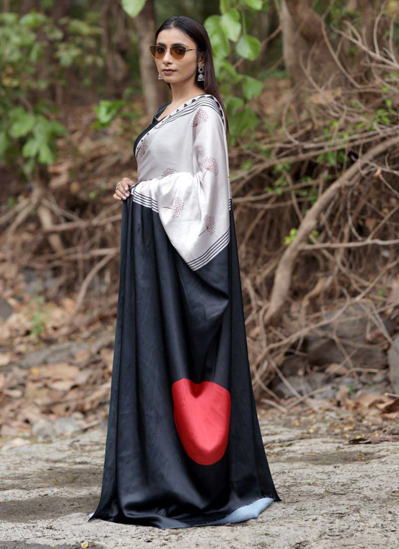 The saree in the image is described as a luxurious Original Japan Satin (Devsena Satin) saree with ensuring comfort and a graceful drape.Silver digital print. It measures 6.30 meters in length and includes a 0.80-meter Banglory satin blouse piece. This type of saree is considered elegant and suitable for festive occasions, weddings, parties, and sophisticated casual wear. The fabric is known for being ultra-soft, lightweight, and glossy,