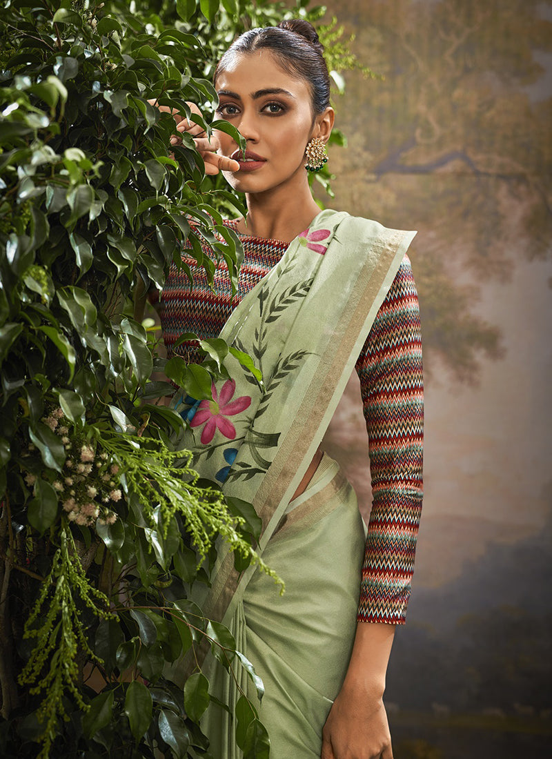 Pista Soft Linen Tissue Kalamkari Blouse Casual Wear Saree