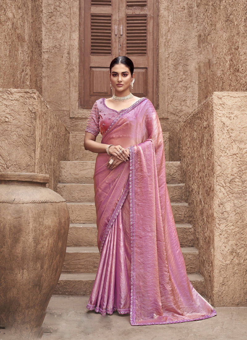 Baby Pink Satin silk Sequence & Hand Embroidery Work Party Wear Designer Saree