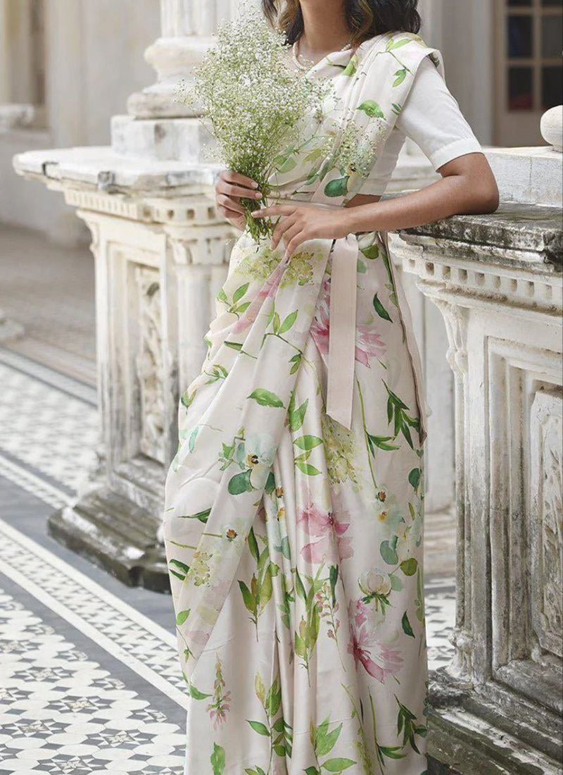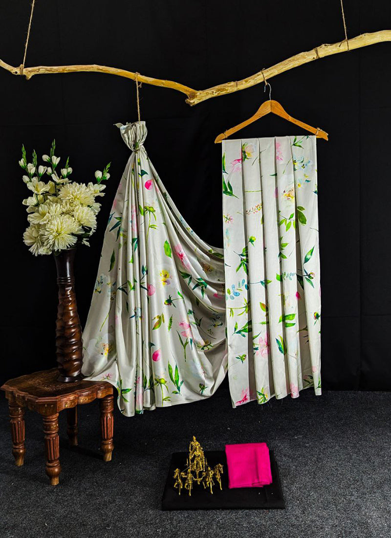 The saree in the image is described as a luxurious Original Japan Satin (Devsena Satin) saree with ensuring comfort and a graceful drape.White digital print. It measures 6.30 meters in length and includes a 0.80-meter Banglory satin blouse piece. This type of saree is considered elegant and suitable for festive occasions, weddings, parties, and sophisticated casual wear. The fabric is known for being ultra-soft, lightweight, and glossy,