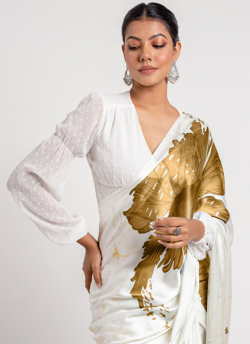 White Original Japan Devsena satin Saree Japan Satin Digital Print Blouse