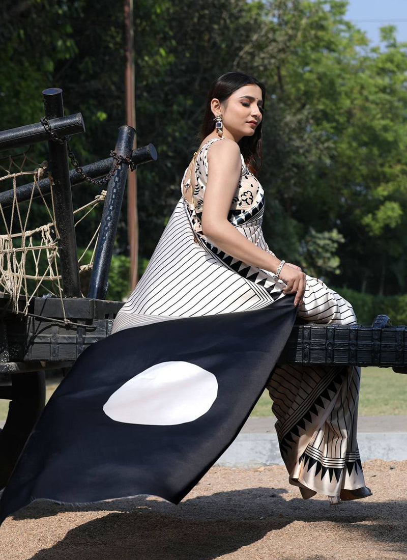 White Original Japan Devsena satin Saree Japan Satin Digital Print Blouse