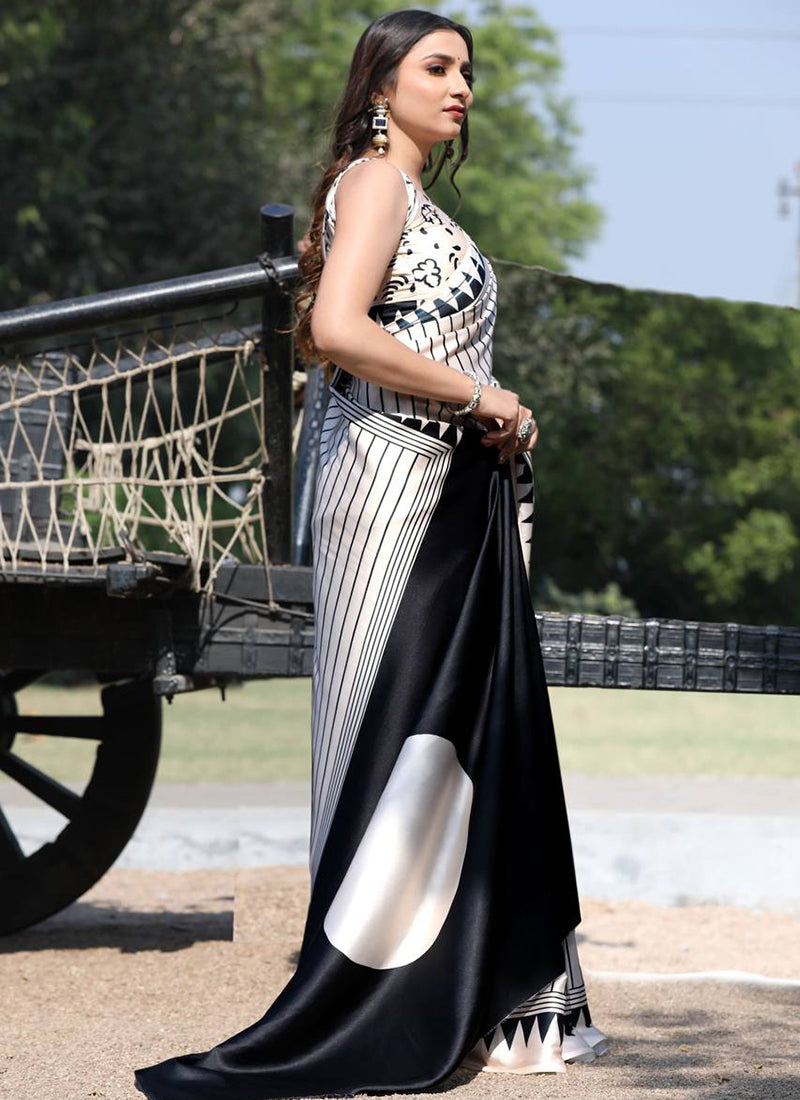 The saree in the image is described as a luxurious Original Japan Satin (Devsena Satin) saree with ensuring comfort and a graceful drape.White digital print. It measures 6.30 meters in length and includes a 0.80-meter Banglory satin blouse piece. This type of saree is considered elegant and suitable for festive occasions, weddings, parties, and sophisticated casual wear. The fabric is known for being ultra-soft, lightweight, and glossy,