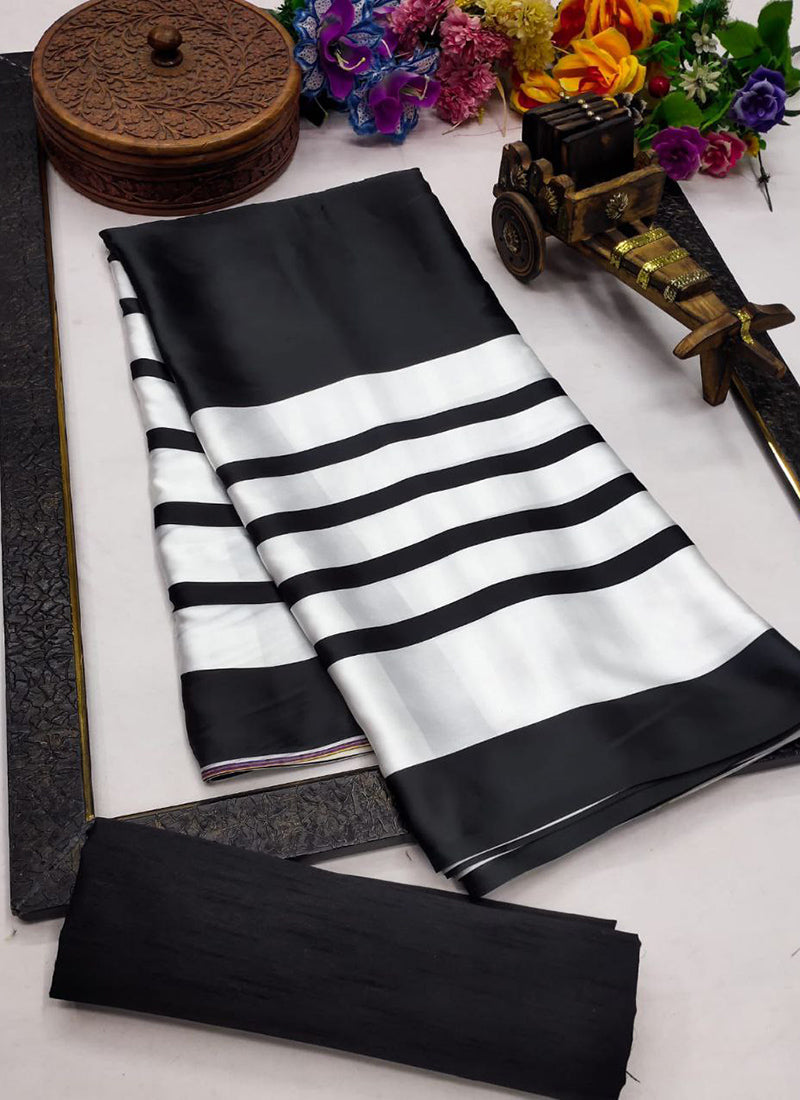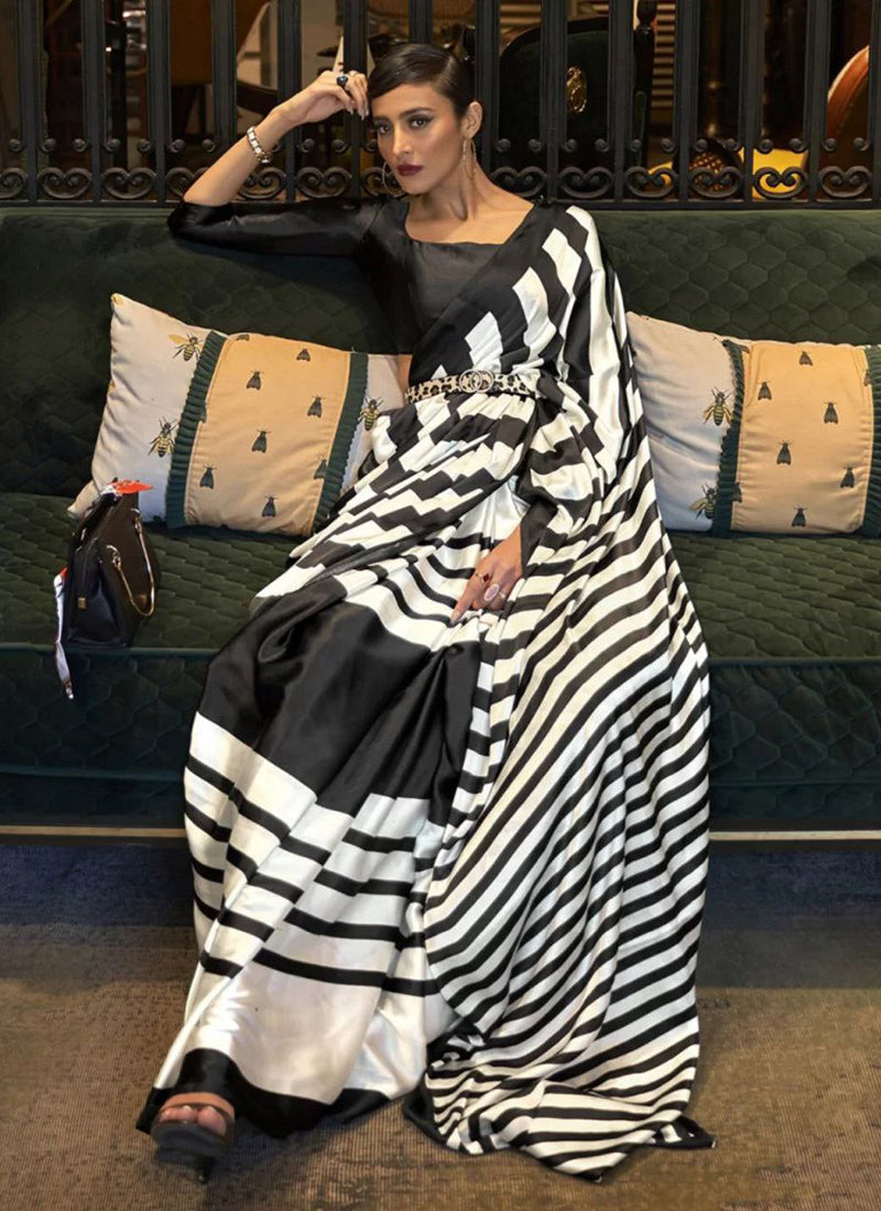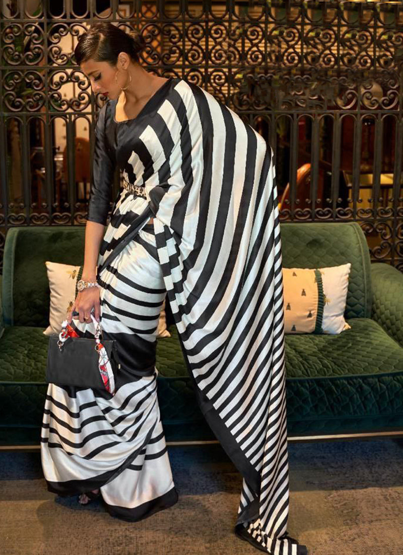 The saree in the image is described as a luxurious Original Japan Satin (Devsena Satin) saree with ensuring comfort and a graceful drape.White digital print. It measures 6.30 meters in length and includes a 0.80-meter Banglory satin blouse piece. This type of saree is considered elegant and suitable for festive occasions, weddings, parties, and sophisticated casual wear. The fabric is known for being ultra-soft, lightweight, and glossy,